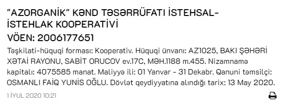 İqtisadiyyat Nazirliyi yanında Dövlət Vergi Xidməti "Azorganik" kənd təsərrüfatı istehsal - istehlak kooperativini 4 milyon 75 min 585 manat nizamnamə kapitalı ilə dövlət qeydiyyatına alıb.