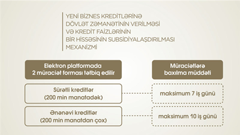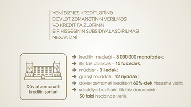 Biznes kreditlərinə dövlət zəmanətinin verilməsi və həmin kreditlər üzrə faizlərin subsidiyalaşdırılması mexanizminə əsasən, 500 milyon manat həcmində yeni biznes krediti portfelinin 60%-dək hissəsinə dövlət zəmanəti verilir, həmçinin həmin kreditlərin illik faiz dərəcəsinin 50%-i dövlət tərəfindən maliyyələşdirilir. Bu mexanizm müddəti 3 ilədək, illik faiz dərəcəsi 15%-dən çox olmayan kreditlərə şamil edilir. Bu kreditlər üzrə güzəşt müddəti 12 aya qədərdir.