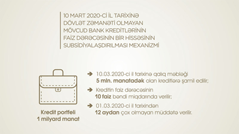 Tətbiq edilən digər yeni mexanizmə uyğun olaraq, pandemiyadan zərər çəkmiş sahələrdə fəaliyyət göstərən sahibkarların dövlət zəmanəti olmayan mövcud 1 milyard manat kredit portfeli üzrə 10 mart 2020-ci il tarixədək manatla aldıqları kreditlərin illik faiz dərəcəsinin 10 faiz bəndi mart ayından başlayaraq 12 ay ərzində dövlət tərəfindən maliyyələşdirilir. Bu mexanizm kreditlərin müddətindən və faiz dərəcəsindən asılı olmayaraq tətbiq edilir.
