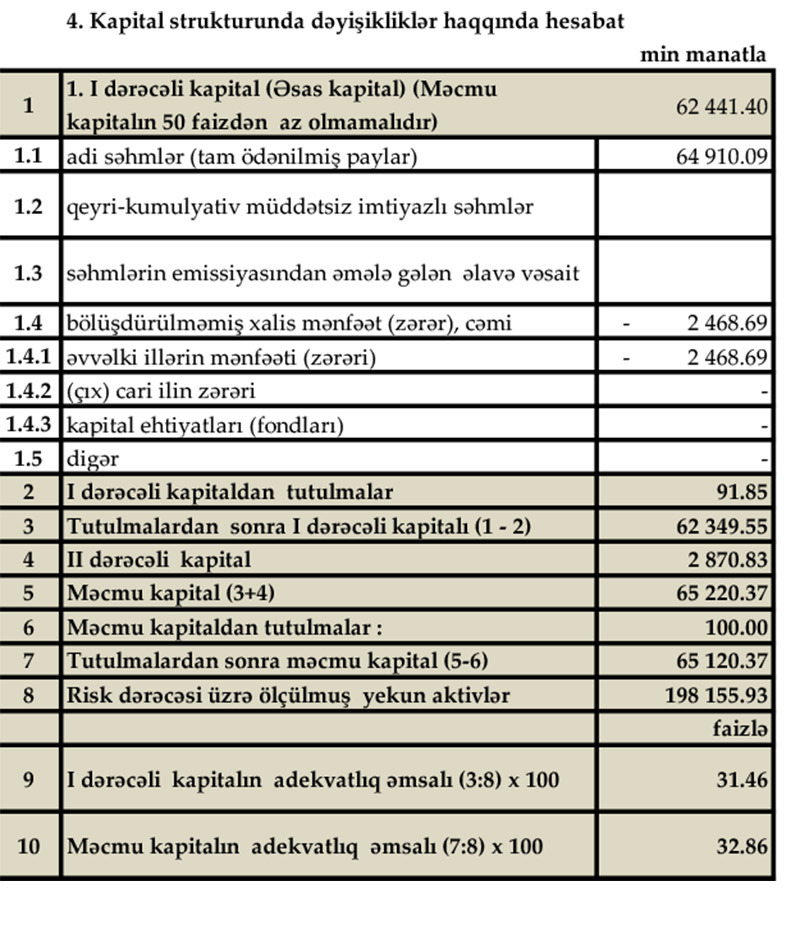Bank 30 İyun 2020-ci il tarixində 65 milyon 120 min manat məcmu kapitala malik olub, bu da minimal tələbdən (50 milyon manat) yüksəkdir.