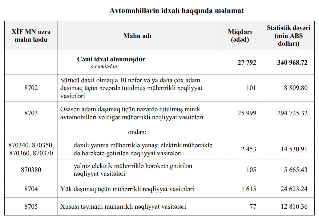 Cari ilin 7 ayında ayda ölkəmizə 25 min 999 ədəd minik avtomobili, 101 ədəd avtobus, 1 615 ədəd yük avtomobili və 77 ədəd xüsusi təyinatlı avtomobil idxal edilib.