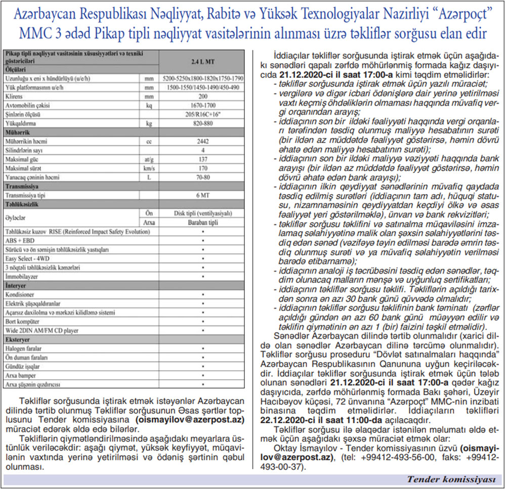 Аzərbаycаn Rеspublikаsı Nəqliyyat, Rabitə və Yüksək Texnologiyalar Nazirliyi “Azərpoçt” MMC 3 ədəd Pikap tipli nəqliyyat vasitələrinin alınması üzrə təkliflər sorğusu elan еdir.