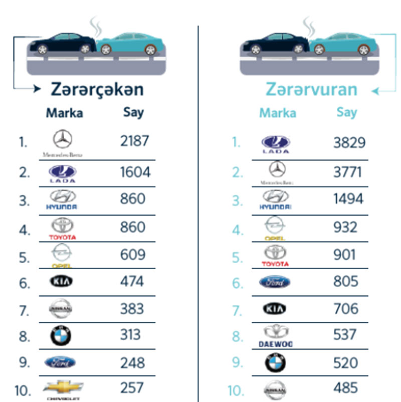 Ladadan sonra ən çox qəza Mercedess-Benz, Hyundai, Opel, Toyota, Ford,Kia, Daewoo, BMW və Nissan markalı avtomobillər ilə törədilib.