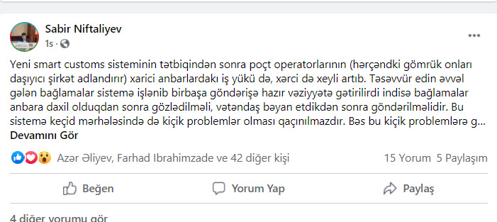 Yeni "smart customs" sisteminin tətbiqindən sonra poçt operatorlarının (hərçəndki gömrük onları daşıyıcı şirkət adlandırır) xarici anbarlardakı iş yükü də, xərci də xeyli artıb. Təsəvvür edin əvvəl gələn bağlamalar sistemə işlənib birbaşa göndərişə hazır vəziyyətə gətirilirdi, indisə bağlamalar anbara daxil olduqdan sonra gözlədilməli, vətəndaş bəyan etdikdən sonra göndərilməlidir. Bu sistemə keçid mərhələsində də kiçik problemlər olması qaçılmazdır. Bəs bu kiçik problemlərə görə şirkəti və müştərini incitmək nə dərəcədə doğrudur? Konkret nümunə üçün bunu deyim ki, dünən gömrük anbarına daxil olan bağlamalardan biri unudulub xarici anbarda qalıb. İndi gömrük deyir ki, o bir bağlama da gəlsin bunları elə çıxarda bilərsiz. Bunda hansısa məntiq əlbəttə ki, yoxdur. Mən artıq bəzi gömrük məmurları özlərinə şirkət qurub və bu mexanizmlə də mövcud şirkətləri sıxışdırmaq niyyətindədədirlər deyə düşünürəm. Mən hələ ki, düşünürəm bunun dəqiq olduğunu yəqin edəndən sonra sizinlə münasibət tam fərqli olacaq. Sonra da çıxıb "bizim xidmətimizdə hansısa qüsur yoxdur" deyə bəyanat verəcəklər.”