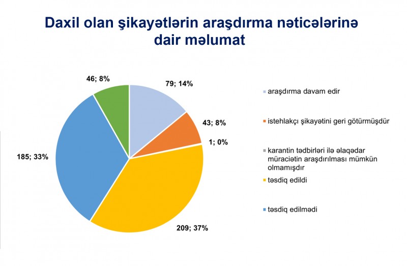 Həmin dövr ərzində istehlakçılar tərəfindən ən çox şikayət olunan qida məhsullarının satış şəbəkəsi “Araz supermarket”, ən çox şikayət olunan un və unlu qənnadı məmulatlarının istehsalı və satışı müəssisəsi “Azza” şirniyyat evi, ən çox şikayət olunan ictimai iaşə müəssisəsi isə Sumqayıt şəhəri, 20-ci məhəllə, Gənclik küçəsində fəaliyyət göstərən “Xan çinar” kafesi olub.