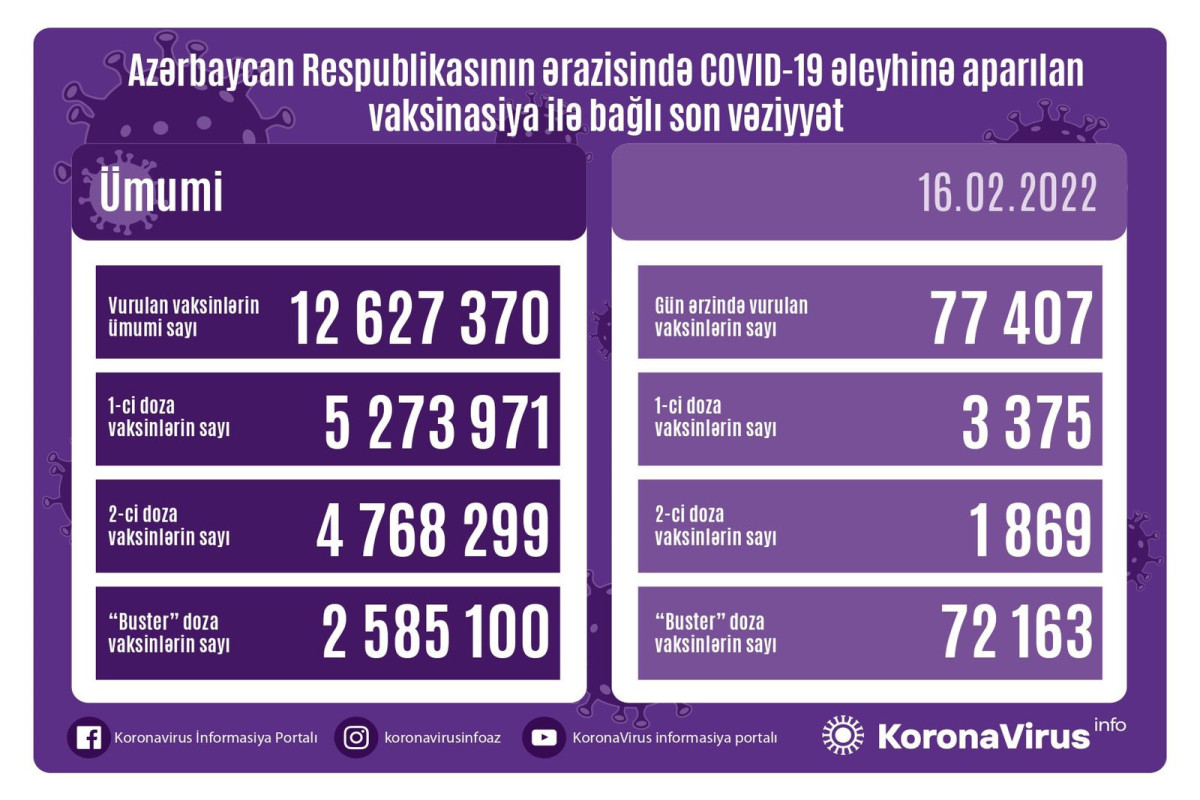 Vurulan vaksinlərin ümumi sayı 12 627 370, birinci mərhələ üzrə vaksinasiya olunanların ümumi sayı 5 273 971, ikinci mərhələ üzrə vaksinasiya olunanların sayı 4 768 299, buster doza üzrə vaksinasiya olunanların sayı isə 2 585 100 təşkil edir.