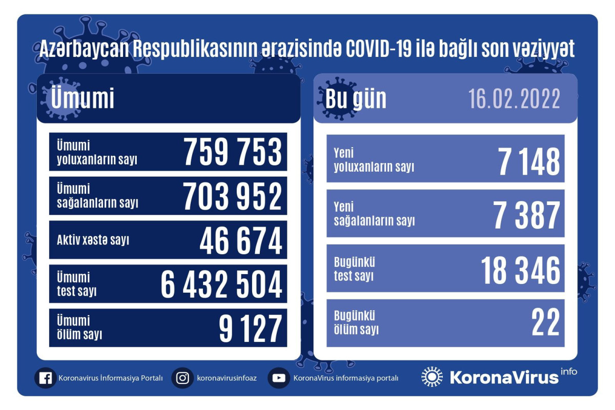Azərbaycanda koronavirus (COVID-19) infeksiyasına 7148 yeni yoluxma faktı qeydə alınıb, 7 387 nəfər müalicə olunaraq sağalıb.