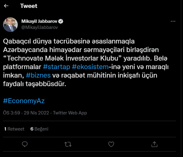 İqtisadiyyat naziri “Technovate Mələk İnvestorlar Klubu”nun yaradıldığı barədə məlumat paylaşdı