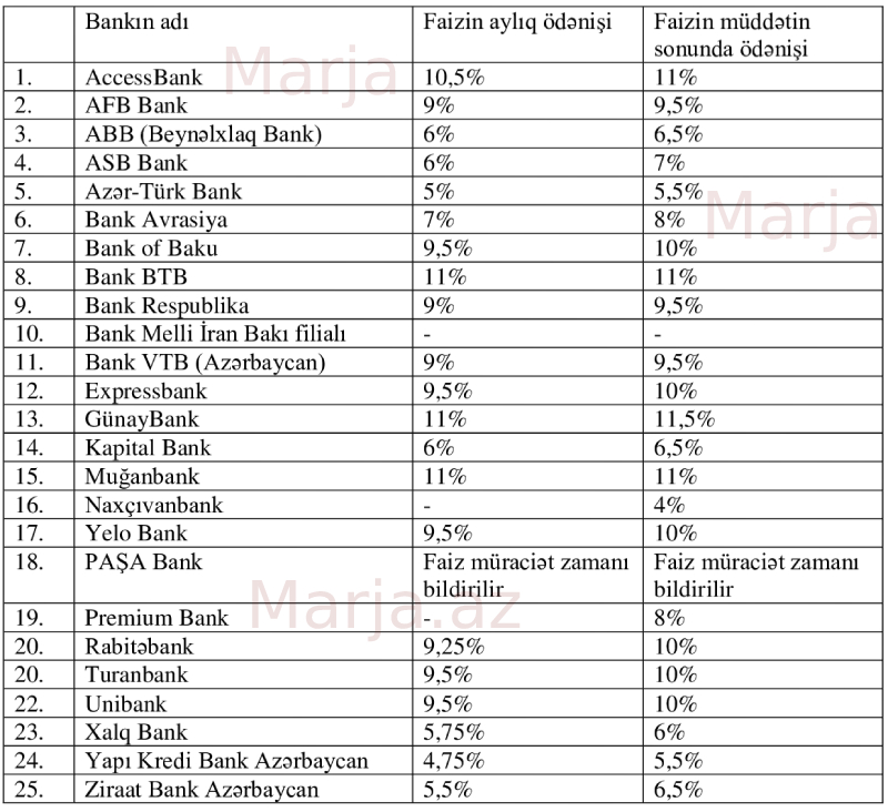 “Marja.az” araşdırmasına əsasən, hazırda 12 ay müddəti üzrə ən yüksək əmanət faizlərini Günay Bank, AccessBank, Bank BTB və Muğanbank təklif edir.