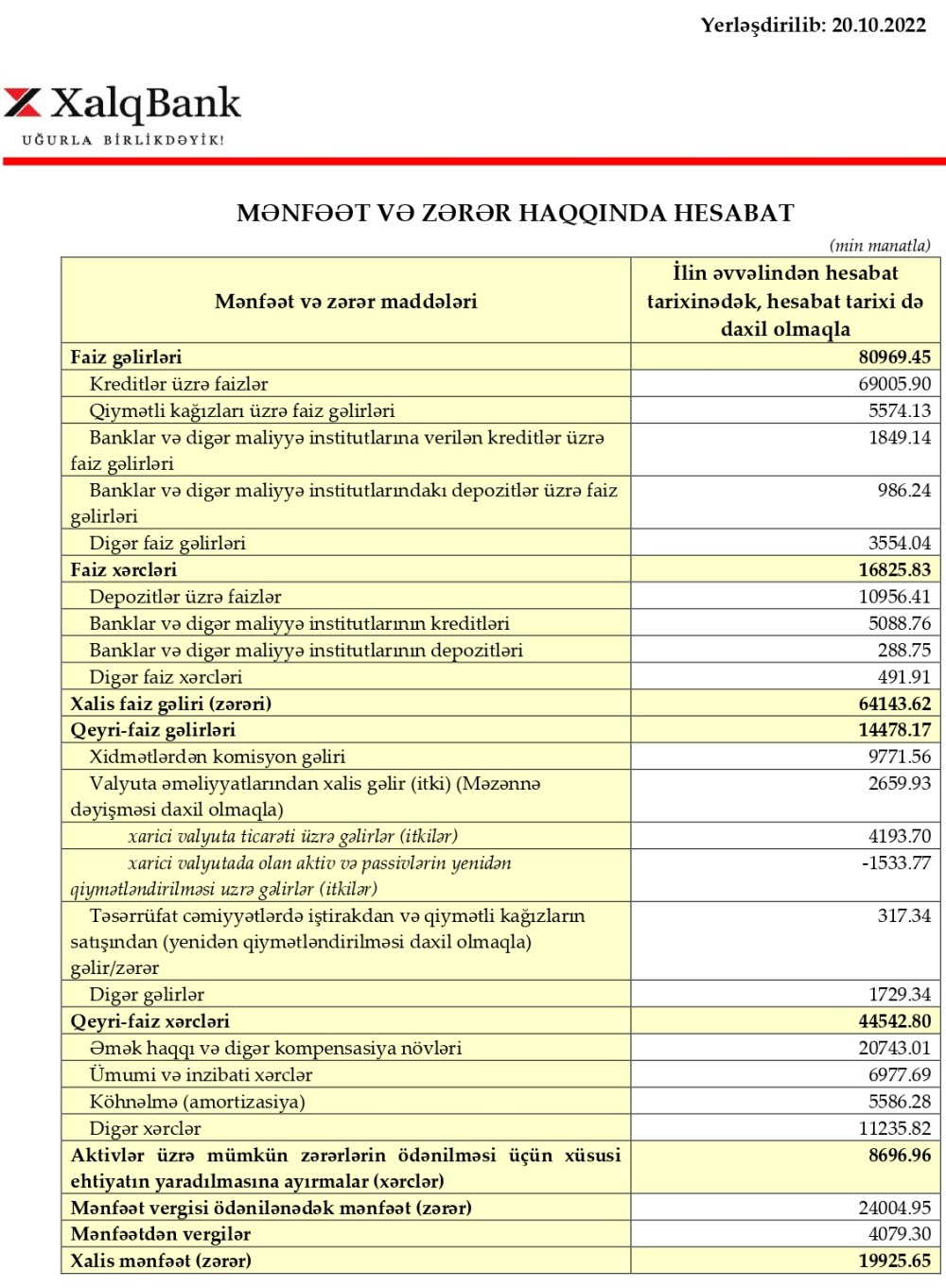 Azərbaycanda 5 ən böyük bankdan biri olan Xalq Bank (ASC "Xalq" Bankı) 2022-ci ilin 9 ayını (yanvar-sentyabr) 19 milyon 926 min manat xalis mənfəət ilə başa vurub. Bankın xalis mənfəəti 2021-ci ilin 9 ayı ilə müqayisədə 2022-ci ilin 9 ayında 5 milyon 682 min manat və ya 39,9% artıb. Xalq Bank ötən ilin yanvar-sentyabr dövrünü 14 milyon 243 min manat xalis mənfəət ilə bağlamışdı. Bankın xalis mənfəətindəki artım faiz və qeyri-faiz gəlirlərinin artması ilə əlaqədardır.