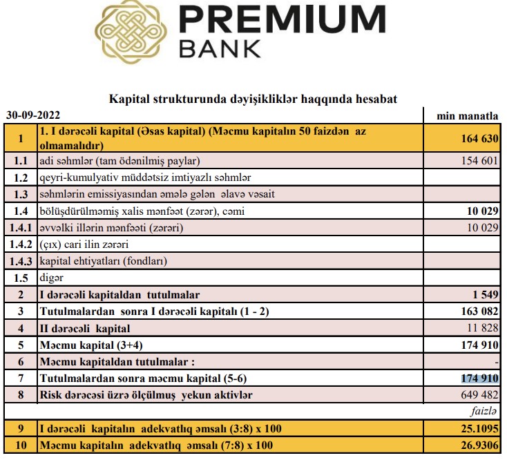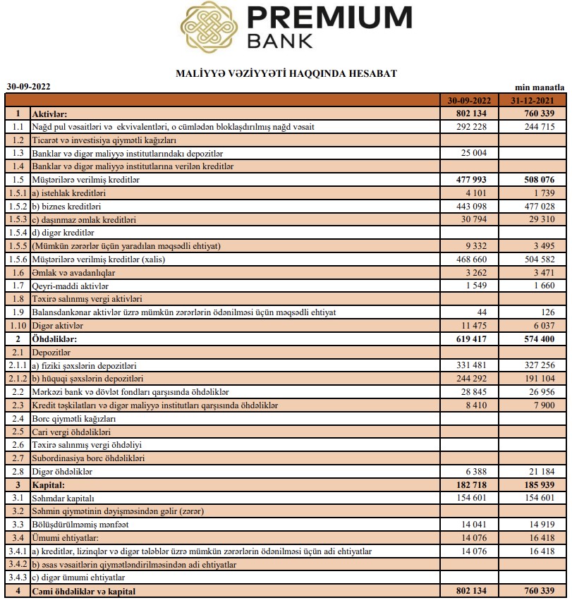 Cari ilin 9 ayı ərzində "Premium Bank"da cəmi depozitlər 57 milyon 413 min manat və ya 11% artaraq 575 milyon 773 min manata çatıb. 30 Sentyabr 2022-ci il tarixində "Premium Bank" ASC 174 milyon 910 min manat məcmu kapitala malik olub ki, bu da minimal məcmu kapital tələbindən 3,5 dəfə çoxdur.