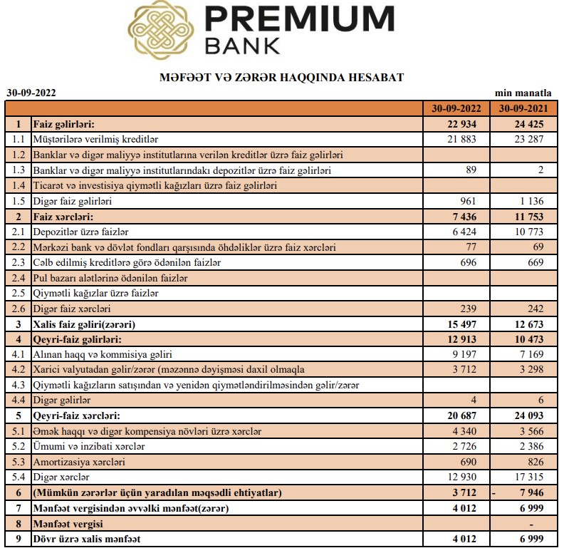 "Premium Bank" ASC 2022-ci ilin 9 ayını (yanvar - sentyabr) 4 milyon 12 min manat xalis mənfəət ilə başa vurub. Bank ötən ilin eyni dövründə 6 milyon 999 min manat xalis mənfəət əldə etmişdi. Ötən ilin yanvar-sentyabr ayında xalis mənfəət mümkün zərərlər üçün yaradılan məqsədli ehtiyatlardan qayıtmış vəsaitin hesabına idi. 2022-ci ilin xalis mənfəti isə Bankın cari fəaliyyətindən qaynaqlanır.