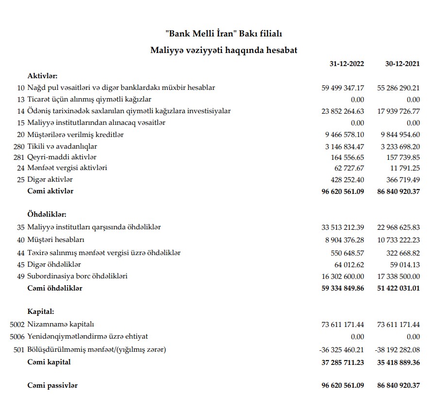 "Bank Melli İran" Bakı filialı 31 dekabr 2022-ci il tarixində 96 milyon 620 min manat cəmi aktivlərə malik olub. Filial 31 dekabr 2021-ci il tarixində 86 milyon 841 min manat cəmi aktivlərə malik idi.