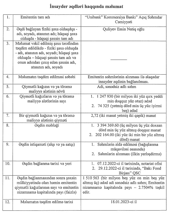 Həmçinin, səhmlərin 202 min 164 manatlıq hissəsini Bankın mövcud səhmdarlarından olan Quliyev Emin Natiq oğlu əldə edib. Eyni zamanda, Emin Quliyev bağışlanma müqaviləsi əsasında 3 milyon 394 min 369 manatlıq səhmlər əldə edib. Əqdlərdən sonra Emin Quliyevin "Unibank"ın nizamnamə kapitalındakı payı 0,3592%-dən 2,7504%-ə yüksəlib.
