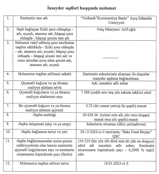 Bunlardan başqa, yeni səhmlərin təxminən 20 min 639 manatlıq hissəsini Hüseynov Faiq Arif oğlu alıb. Əqd nəticəsində Faiq Hüseynovun "Unibank"ın nizamnamə kapitalındakı payı 0,2797%-dən 0,2808%-ə yüksəlib.