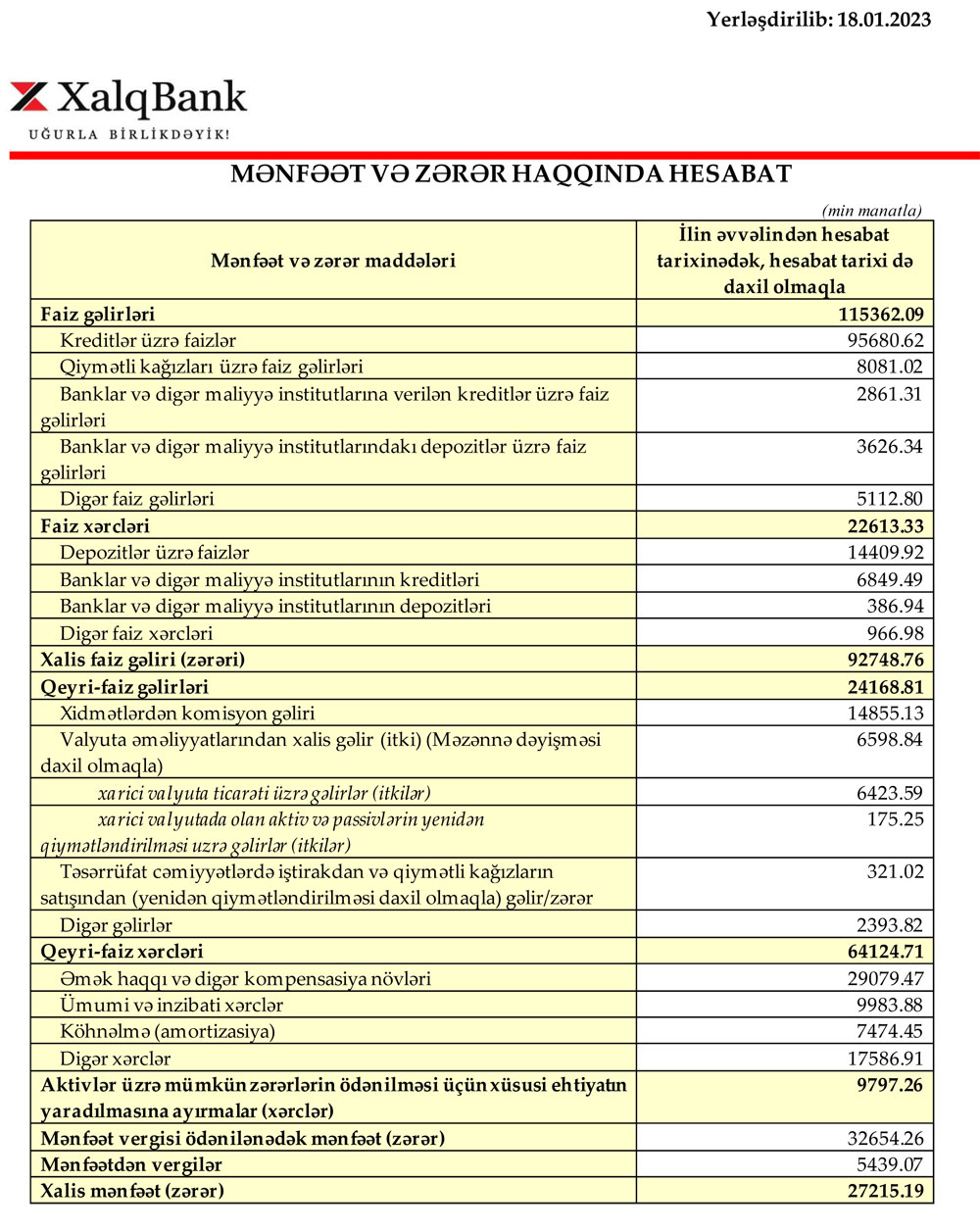 Xalq Bank 2022-ci ili 27 milyon 220 min manat xalis mənfəəti ilə başa vurub.