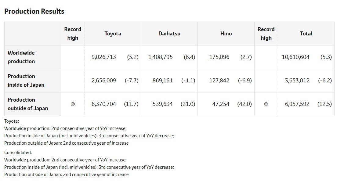 Toyota üçün də bəzi çiplə bağlı tədarük məhdudiyyətləri qalmasına baxmayaraq, Yapon avtomobil istehsalçısı Asiyada güclü tələbatın, Asiya və Şimali Amerikada istehsal gücünü və optimallaşdırmanı artması sayəsində 2022-ci ildə qlobal istehsalını 5,3% artıra bilib.