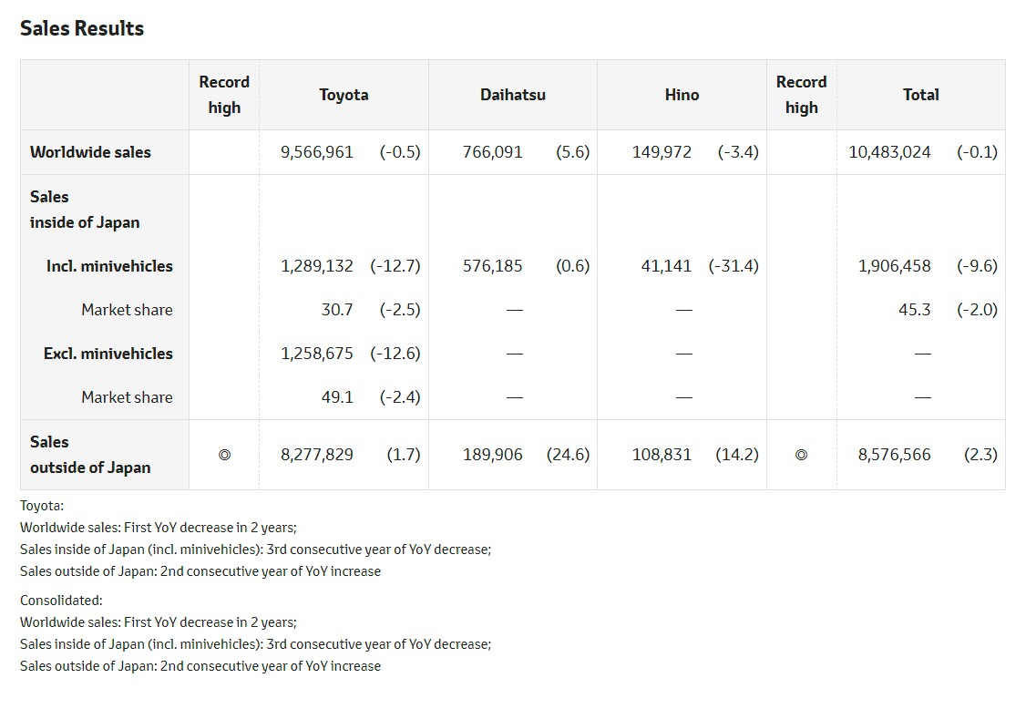 Marja xəbər verir ki, Qrupun yük maşını bölməsi Hino Motors və kiçik avtomobil istehsalçısı Daihatsu da daxil olmaqla qlobal satışları 0,1% azalıb. Belə ki, 8,6 milyon avtomobilin Yaponiya xaricinə rekord satışı (2,3% artıb) onun daxili bazarındakı satışının 9,6% azalmasının böyük hissəsini kopmensasiya edib.