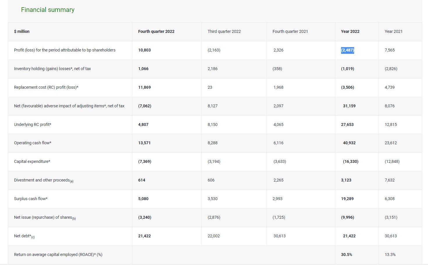 2022-ci ildə BP-nin hasilatının həcmi gündəlik 2 milyon 253 min barel neft ekvivalenti təşkil edib ki, bu da əvvəlki ilin analoji göstəricisindən 1,6% çoxdur.