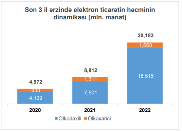 Ölkədə ödəniş kartları ilə aparılan nağdsız ödənişlərin böyük hissəsi elektron ticarət əməliyyatlarının payına düşmüşdür. 2022-ci il ərzində elektron ticarət əməliyyatlarının sayı 2021-ci il ilə müqayisədə 2.4 dəfə artaraq 261 mln. ədəd, həcmi isə 2.5 dəfə artaraq 18.5 mlrd. manat olmuşdur.