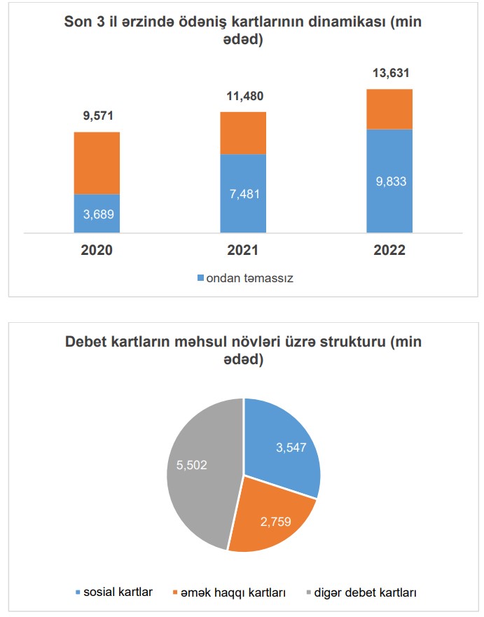 Qeyd edilib ki, 01.01.2023-cü il tarixinə dövriyyədə olan ödəniş kartlarının sayı 13.6 mln. ədəd təşkil etmiş və bu kartların 72%-i təmassız ödənişləri dəstəkləmişdir. 2021-ci il ilə müqayisədə ödəniş kartlarının sayı 19%, o cümlədən təmassız kartların sayı 31% artmışdır. Emissiya edilən ödəniş kartlarının 87%-ni (11.8 mln. ədəd) debet kartlar, 13%-ni (1.8 mln. ədəd) isə kredit kartları təşkil etmişdir.