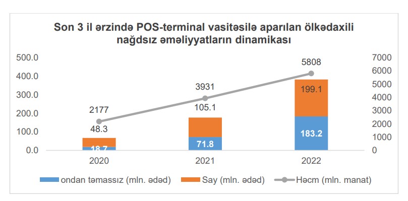 Təsərrüfat subyektlərində 2022-ci il ərzində POS-terminal vasitəsilə aparılan nağdsız əməliyyatların sayı 2021-ci il ilə müqayisədə 89.4% artaraq 199 milyon ədəd, həcmi isə 47.7% artaraq 5.8 milyard manat olmuşdur. O cümlədən, 2022-ci il ərzində POS-terminallarla aparılan təmassız ödənişlərin sayı 2021-ci il ilə müqayisədə 2.6 dəfə artaraq 183.2 milyon ədəd, həcmi isə 2 dəfə artaraq 4.9 milyard manat olmuşdur.