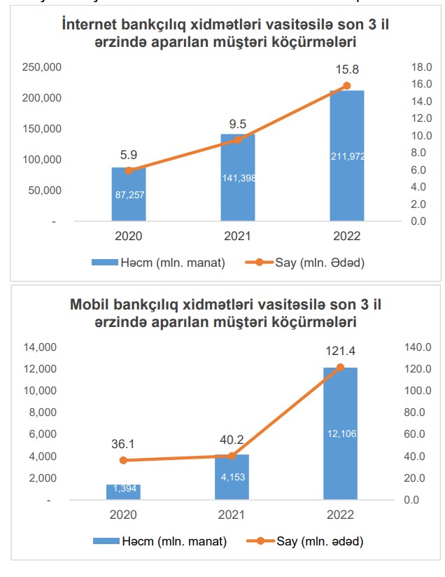 2022-ci il ərzində internet bankçılıq xidmətləri vasitəsilə aparılan müştəri köçürmələrinin həcmi 2021-ci illə müqayisədə 50% artaraq 212 mlrd. manat, mobil bankçılıq xidmətləri vasitəsilə aparılan müştəri köçürmələrinin həcmi isə 3 dəfə artaraq 12.1 mlrd. manat olmuşdur.