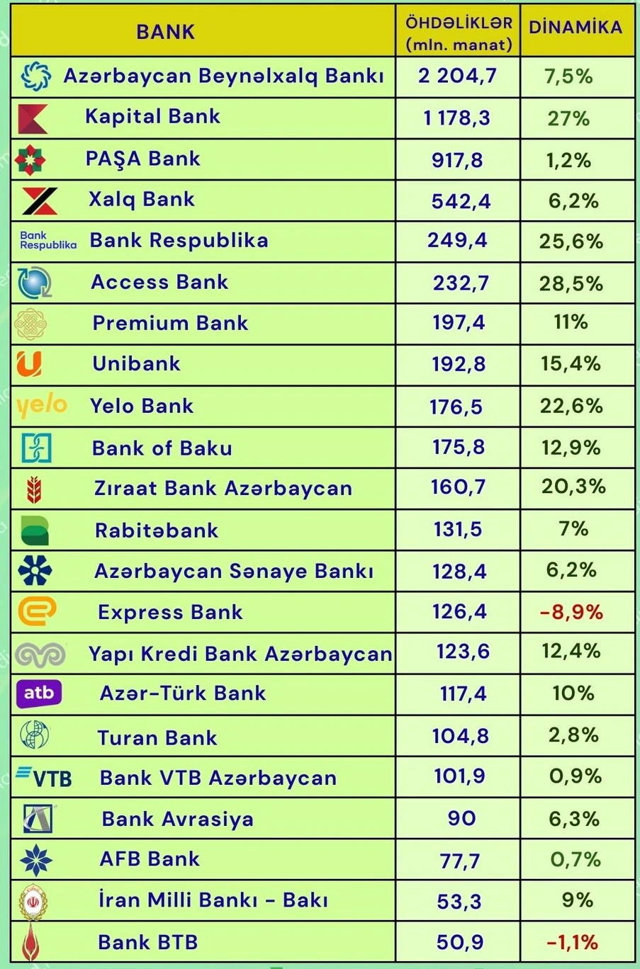 Bunlar, “Azərbaycan Beynəlxalq Bankı” (2 milyard 204,7 milyon manat), “Kapital Bank” (1 milyard 178,3 milyon manat), “PAŞA Bank” (917,8 milyon manat), “Xalq Bank” (542,5 milyon manat) və “Bank Respublika”dır (249,4 milyon manat).