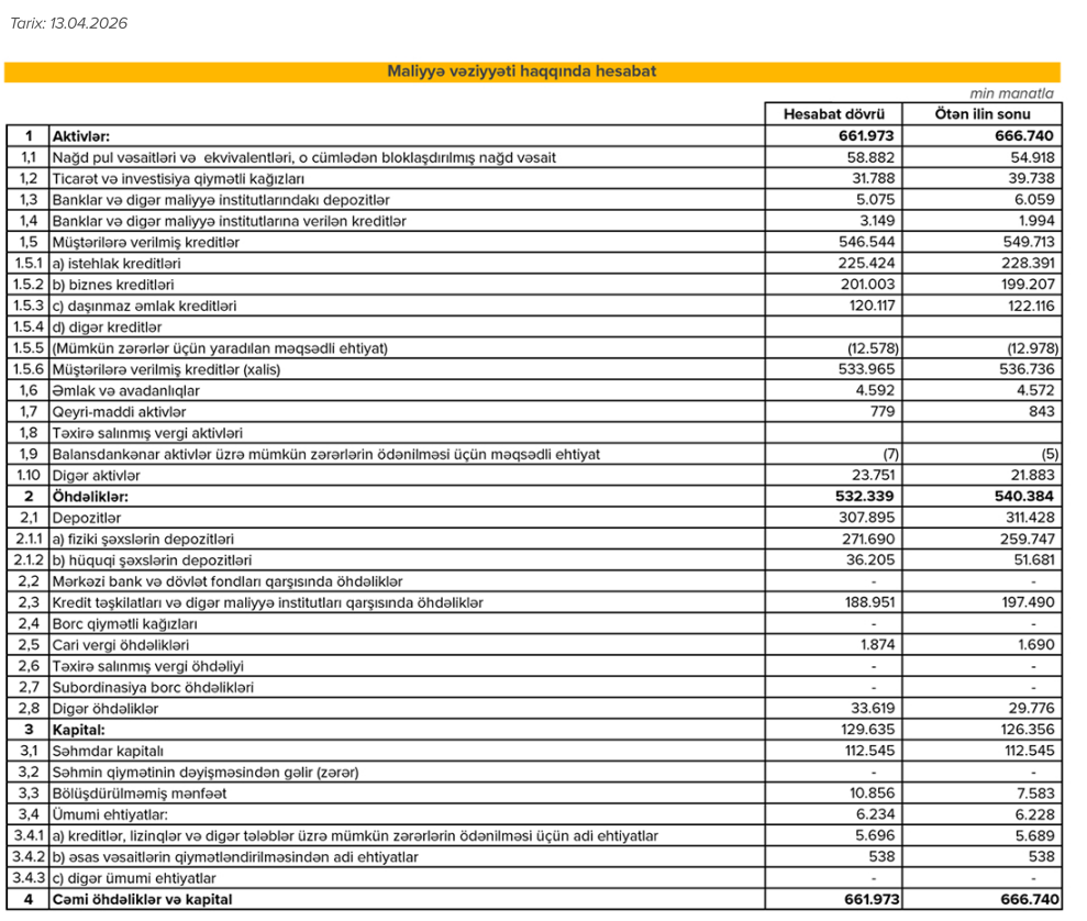 Hesabat dövrünün sonuna Bankın cəmi aktivləri 661,973 milyon manat, depozit portfeli 307,871 milyon manat, kredit portfeli isə 546,543 milyon manat təşkil edib.