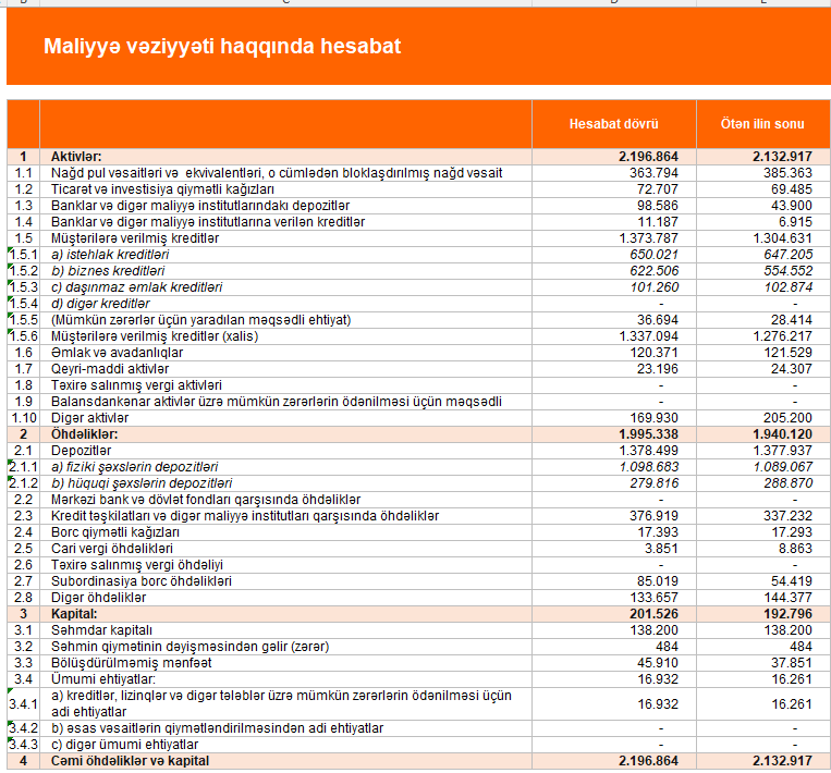 2026-cı il 31 mart tarixinə bankın cəmi aktivləri 2 milyard 196 milyon 864 min manat təşkil edib. Bu göstərici 2025-ci ilin sonu ilə müqayisədə 63 milyon 947 min manat və ya 3 % artıb.