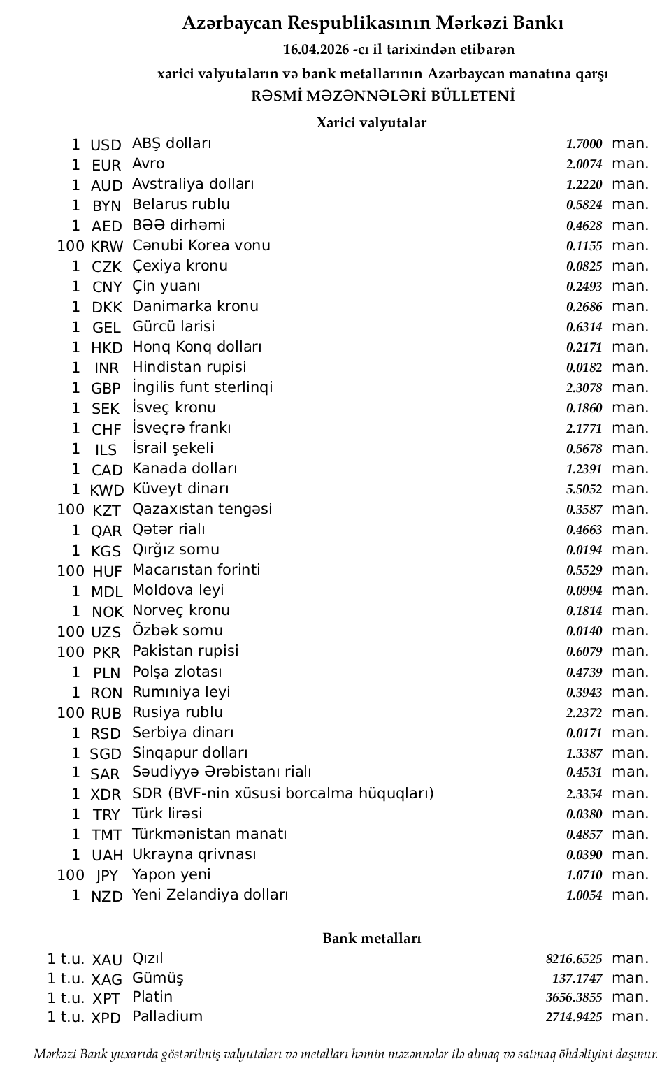 Rəsmi məzənnələr açıqlandı
