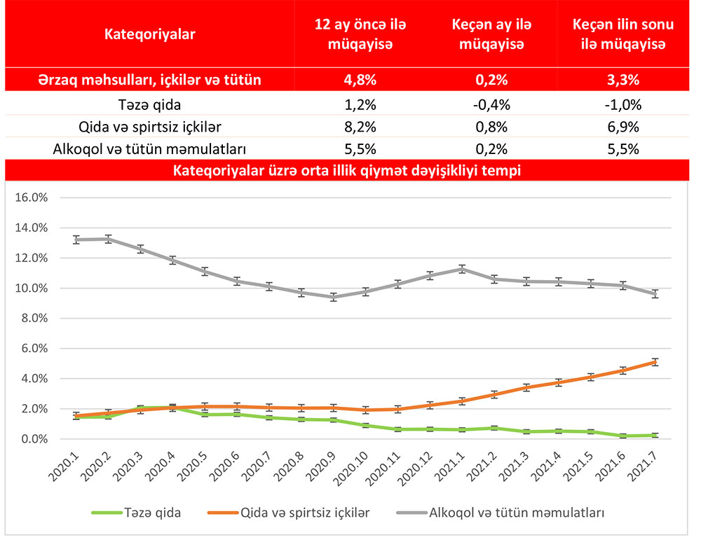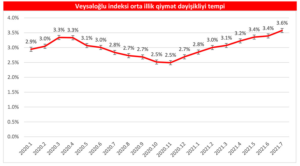 “Veysəloğlu Pərakəndə İndeksi”nə daxil edilən məhsulların qiymətində 2021-ci ilin iyul ayında 2020-ci ilin iyul ayı ilə müqayisədə 4.8% artım müşahidə edilir.Belə ki, 2021-ci il iyul ayında 2020-ci ilin iyul ayı ilə müqayisədə təzə qida məhsullarında 1,2%, qida və spirtsiz içkilərdə 8,2%, alkoqol və tütün məmulatlarında isə 5,5% artım olub.