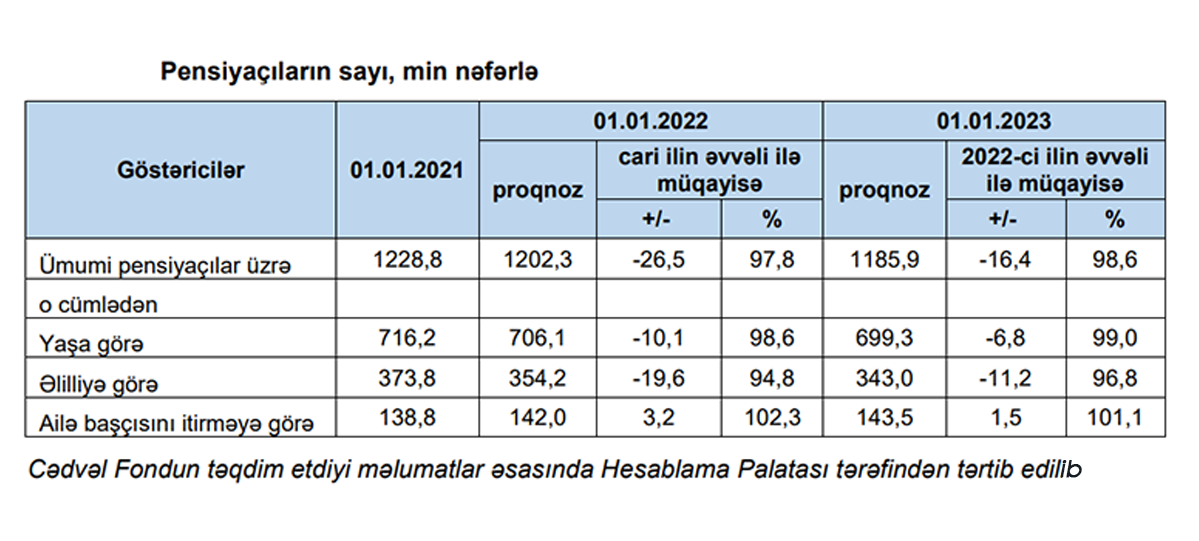 Rəydə qeyd edilib ki, təqdim edilmiş proqnoz göstəricilərinə əsasən, cari ilin sonunda pensiyaçıların sayı ilin əvvəli ilə müqayisədə 26,5 min nəfər azalacaq ki, bu da yaşa görə pensiya ilə təmin ediləcək şəxslərin sayının 10,1 min nəfər, əlilliyə görə pensiya ilə təmin olunacaq şəxslərin sayının 19,6 min nəfər azalması, ailə başçısını itirməyə görə pensiya ilə təmin olunacaq şəxslərin sayının isə 3,2 min nəfər artması hesabına baş verəcək.